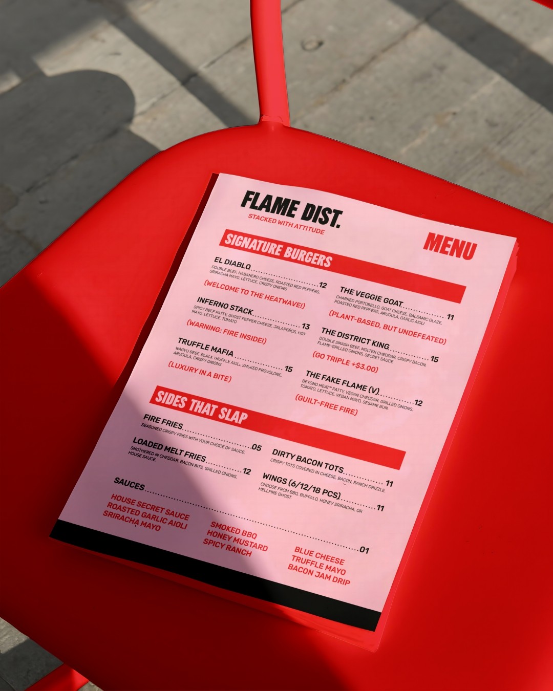Flame District takes burgers to the next level with bold flavors, stacked creations, and a brand that’s as fiery as the grill itself. The goal was to create an identity that felt unapologetic and full of attitude, while still being approachable and fun.